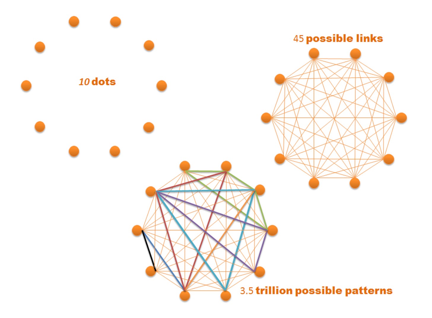 The images below reinforce how more dots (even in the flattened 2D sense) lead to patterns that are impossible to explore in total.