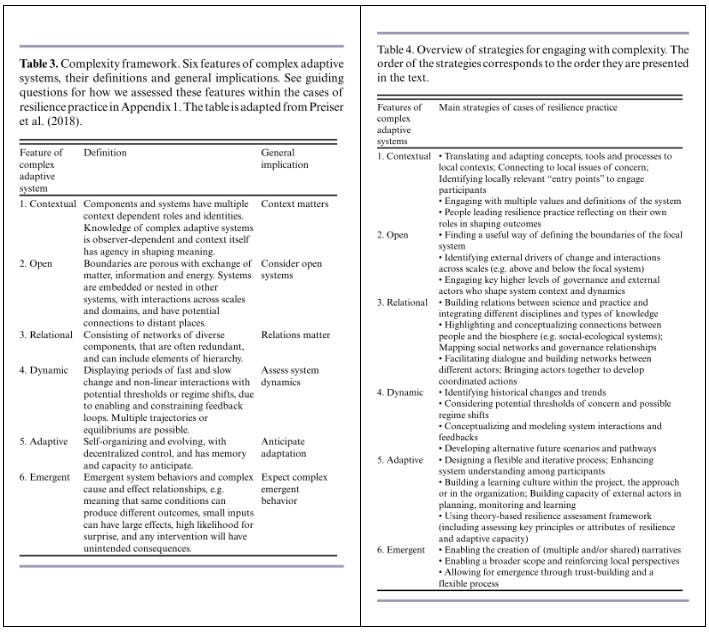 What are the features of a CAS? Sellberg and colleagues pull from the work of Presier et. al., who synthesized the work of many complex adaptive systems scholars and thus describing them via six salient features “to identify activities and strategies used in the cases to deal with the real-world complexity of social-ecological systems, we used a framework of six general features of complex adaptive systems (Preiser et al. 2018). The six features are: 1) contextual, 2) open, 3) relational, 4) dynamic, 5) adaptive, and 6) emergent.”